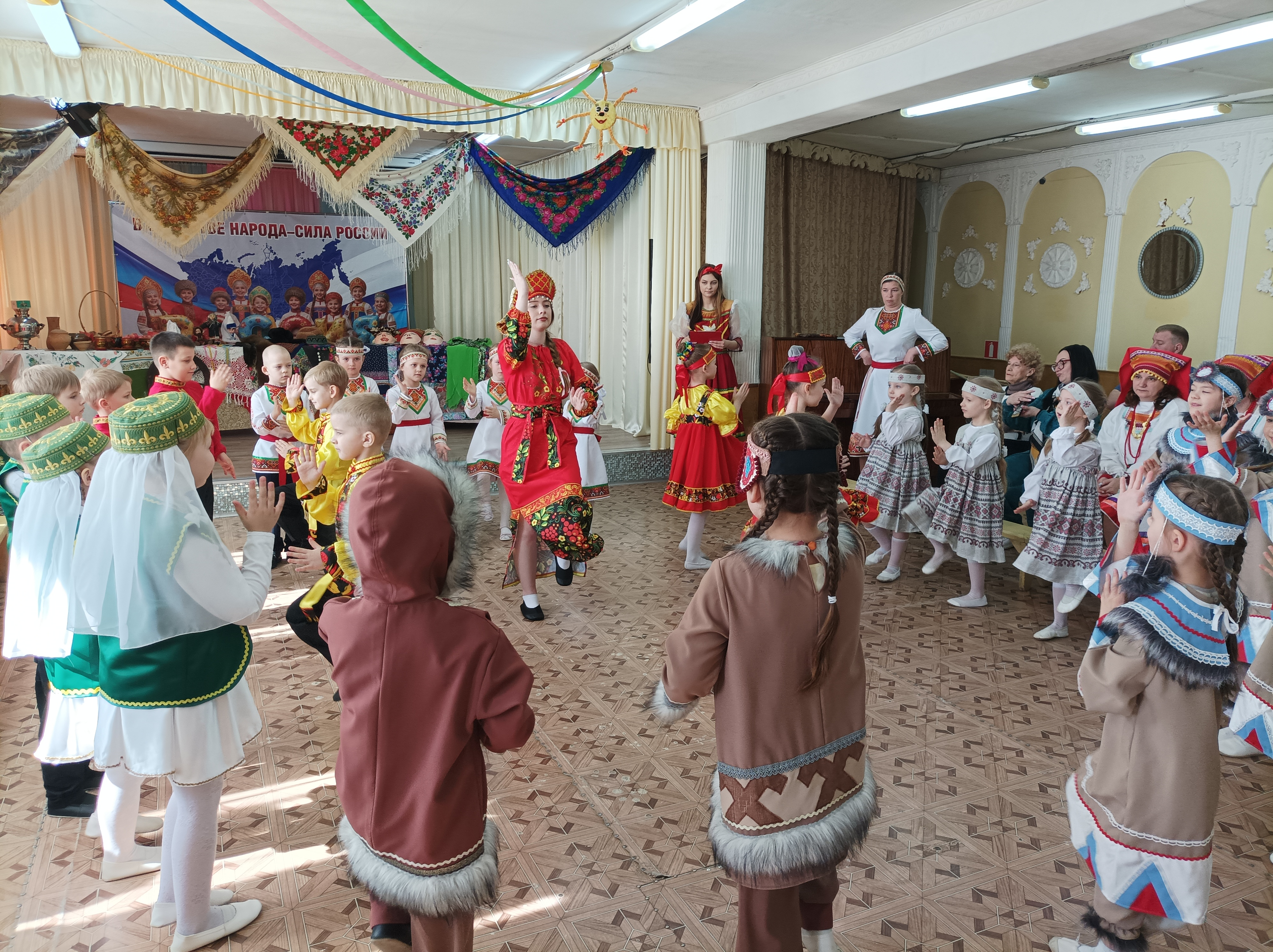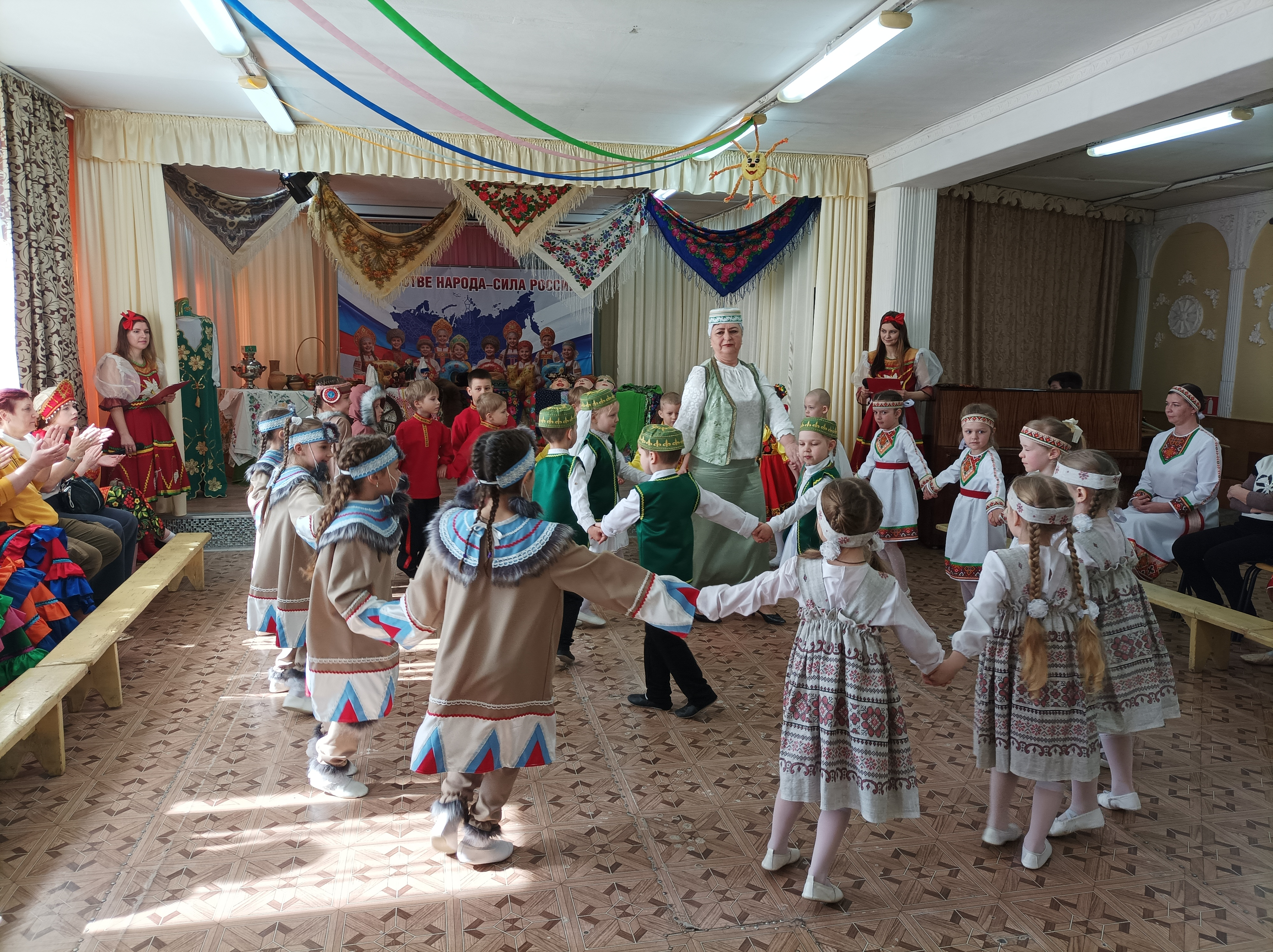Участники из 19 дошкольных образовательных учреждений (детские сады № 4, 6, 8, 13, 17, 21, 22, 27, 29, 30, 35, 37, 38, 41, 42 и школы № 3, 17, Коневская, Липовская) представили разные народности, проживающие на территории Российской федерации: русские, татары, мордва, башкиры, народы крайнего севера и другие. В ярких танцах и играх были отражены культура, традиции, обычаи и характер представляемого народа.